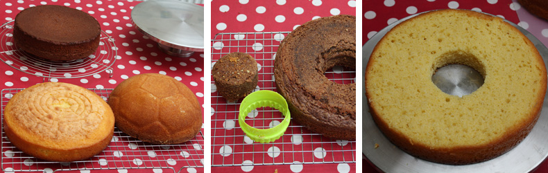 Découpez à l’aide de l’emporte-pièce un trou au milieu des cakes. Vous créez un espace pour placer votre Barbie. Découpez également, à l’aide d’un grand couteau les croûtes du cake, cela le rendra plus moelleux.