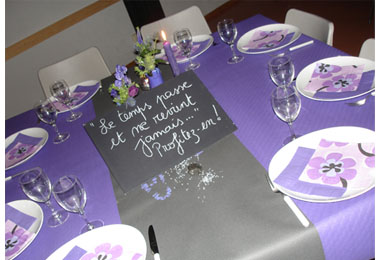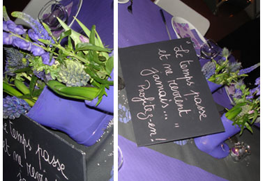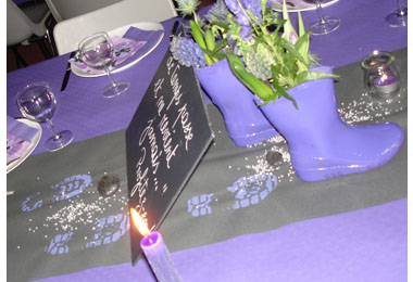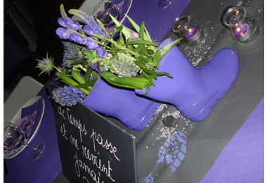Partout, des bottes d’enfants peintes en mauve, porteuses de quelques fleurs mauves et de bougies.