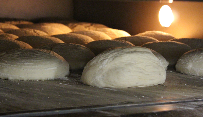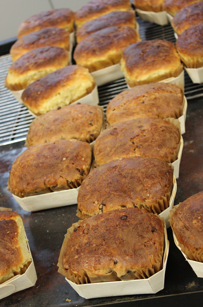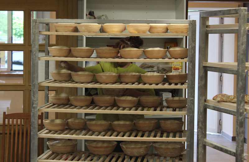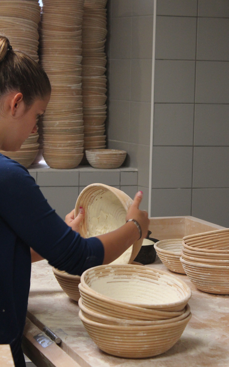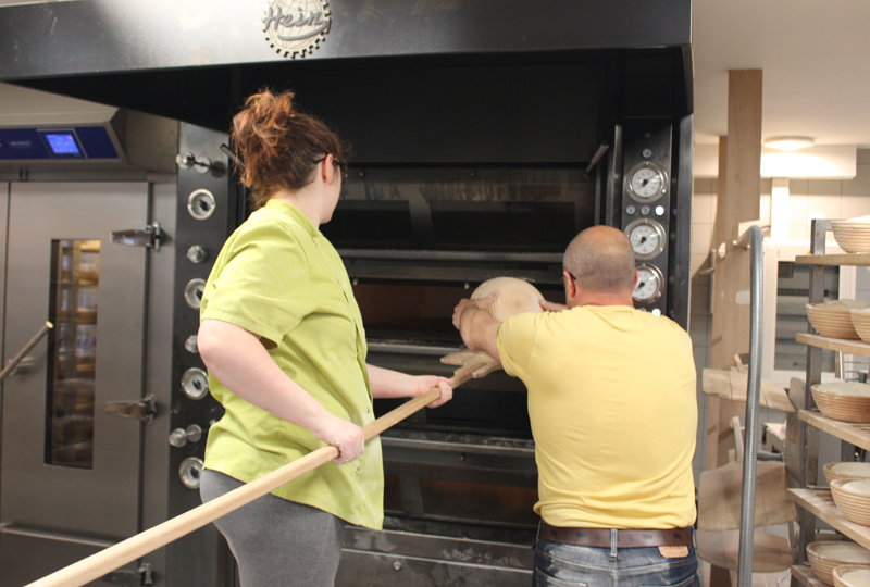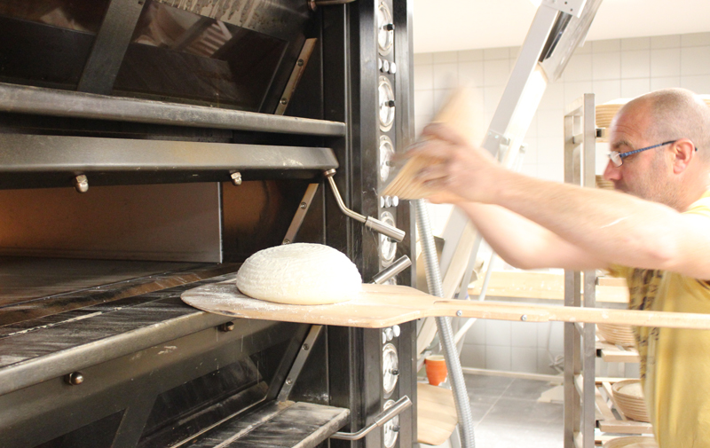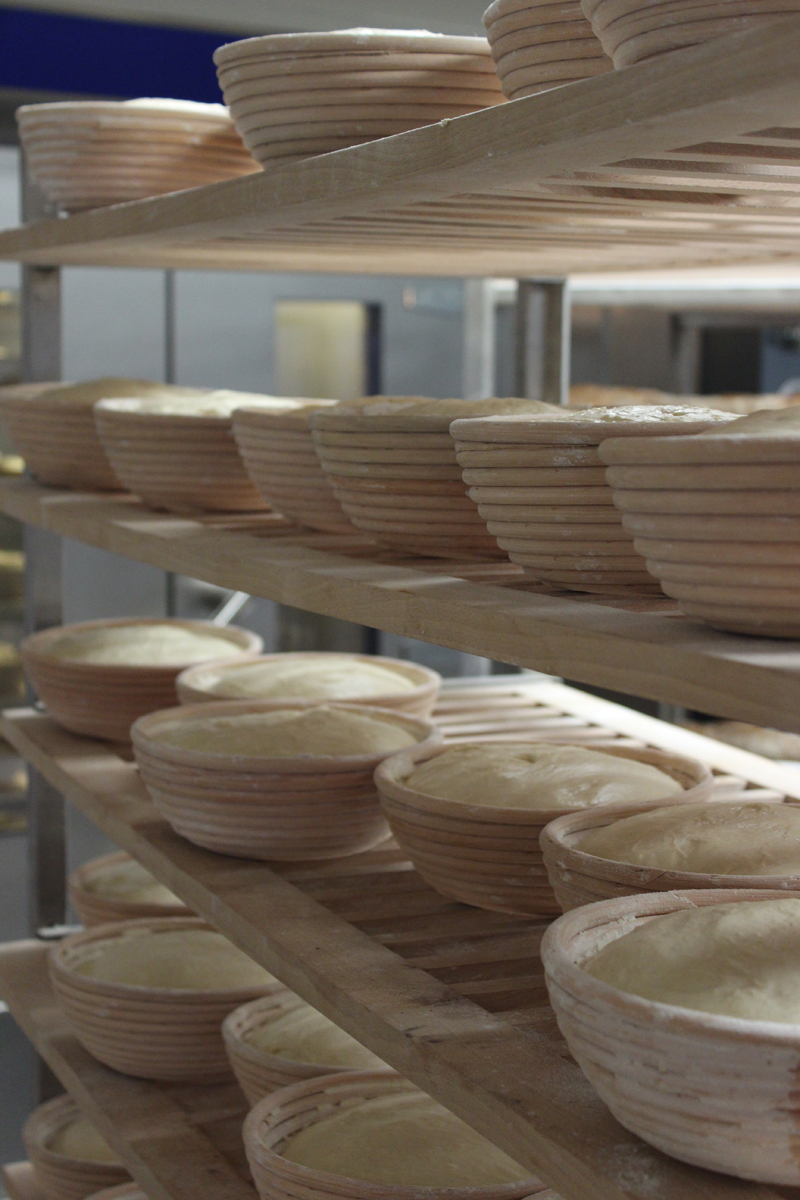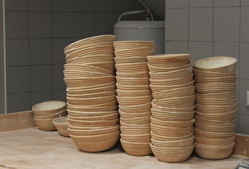 La pâte est préparée à l’aide d’un pétrin électrique, déposé sur un plan de travail en bois, pesé et déposé pour la levée dans des paniers en bois qui donne aux pains leur forme et qui dessine joliment le haut en tourbillon. En fonction de la production du jour, les pains poussent à l’air libre ou sont mis dans des chambres chaudes pour accélérer la montée. Ensuite, ils sont enfournés 1 par 1 dans un four à 250 degrés durant 50 minutes.