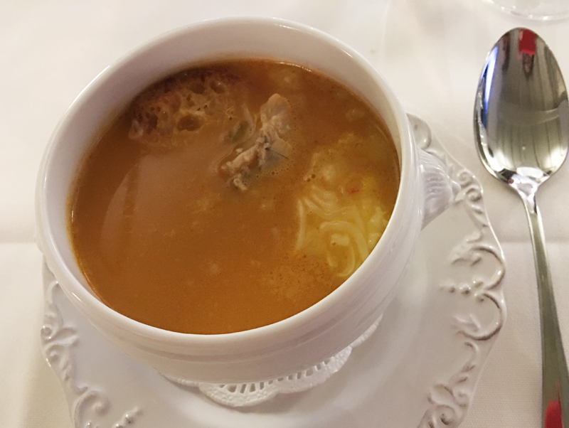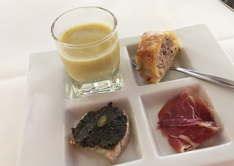 - Petite mise en bouche : soupe de légumes de saison, Avisance, pata negra et toasts tapenade et anchois