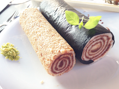 Sushi de pain beurré, pâte à tartiner chocolat, café et crunch de noisettes Une création de Roger Van Damme, Het Gebaar* Servi avec un Fortissio Lungo
