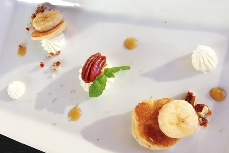 Pancake au fromage frais, sirop d’érable, bananes et noix de pécan caramélisées Une création de Jean-Philippe Darcis, maître-chocolatier Servi avec un Vivalto Lungo Decaffeinato