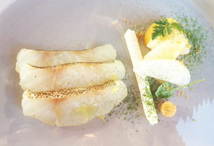 Fromage blanc au lieu jaune fumé, navets et radis Une création de Filip Claeys, De Jonkman** Servi avec un Linizio Lungo