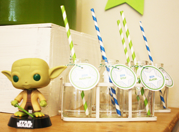 Un thème pour tous les amoureux de Star Wars travaillé de l’invitation au sac en papier kraft blanc que les invités peuvent remplir avec le contenant des bonbonnières du bar à desserts